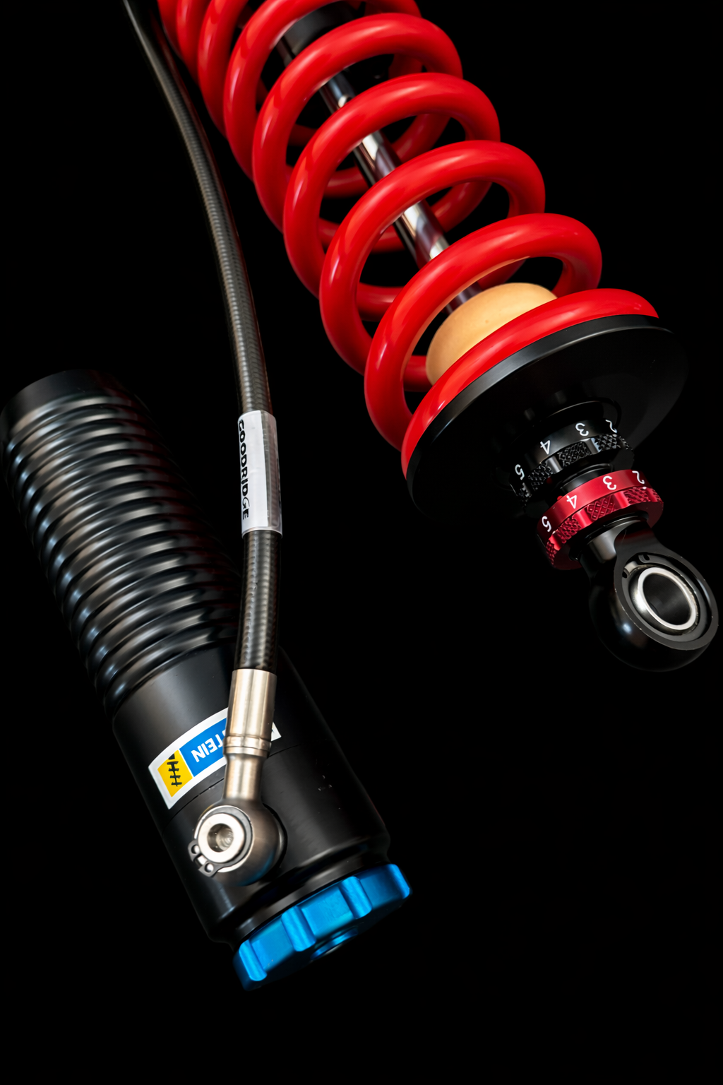 Eibach–Bilstein suspension system, height-adjustable and 3-way adjustable with external reservoir. Adjustment of rebound and high- and low-speed compression with 10 clicks.